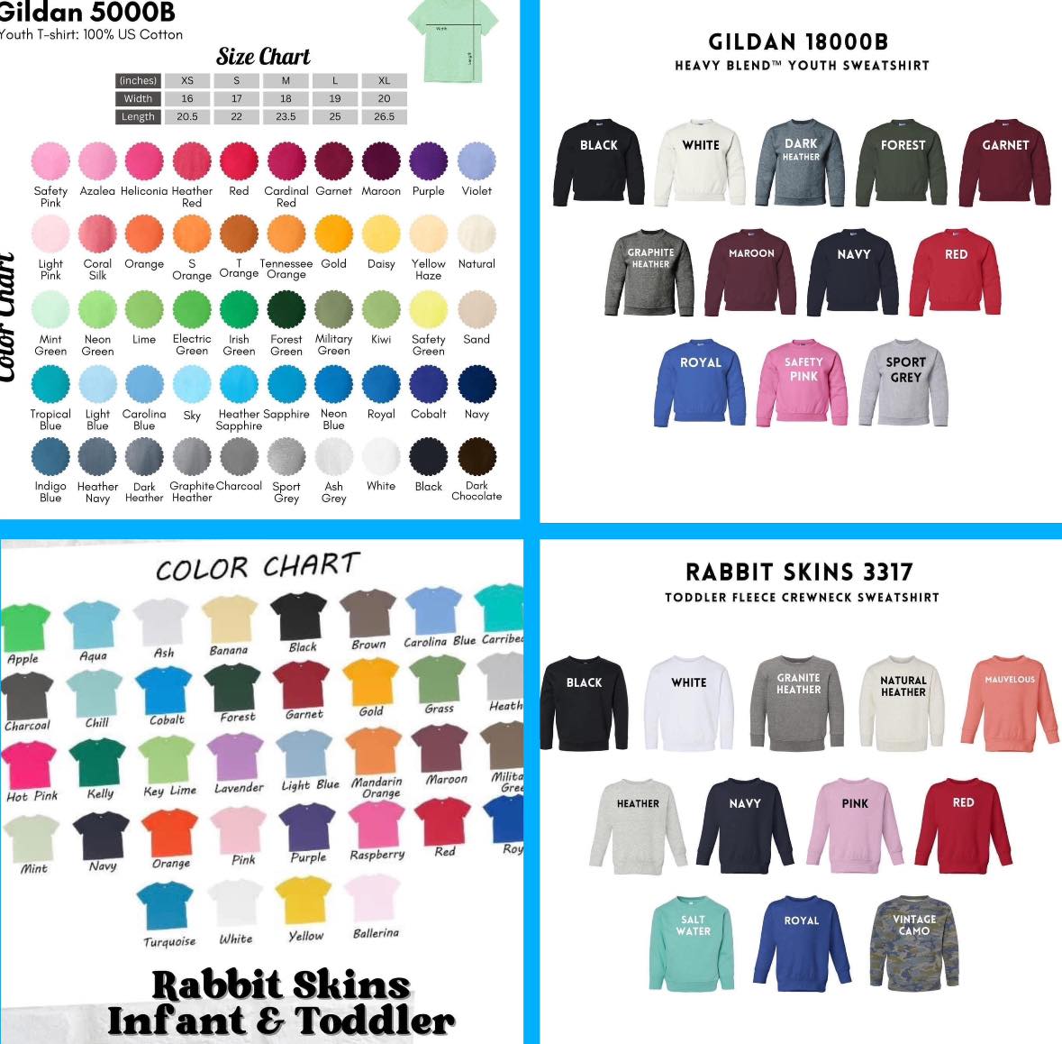All colors and size charts in photos - COLORS WILL VARY BASED ON BRAND. Please note that Youth colors are different than Adult.